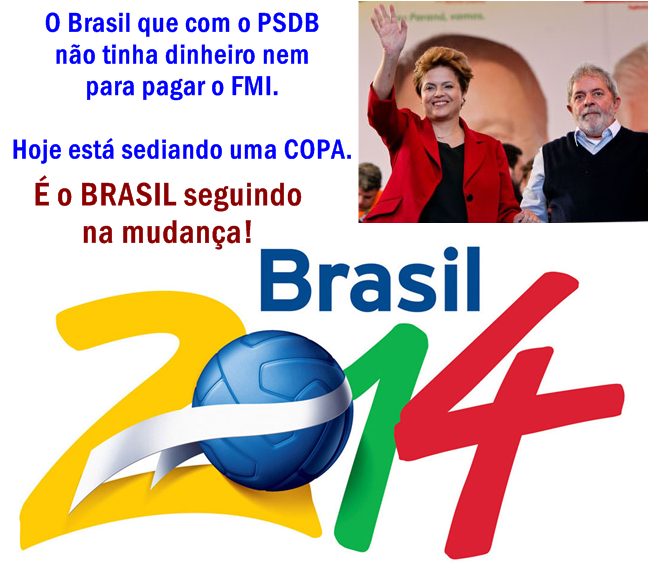 A melhor copa de todos os tempos está sendo realizada no Brasil, a única que foram vendidos todos os ingressos, inclusive alguns torcedores de países que foram para casa mais cedo conseguiram revender seus ingressos e o mais curioso é ver a velha direita filha da ditadura que usava a copa para fazer campanha contra o PT, todos nos estádios, são deputados, senadores e jornalistas, que ficam secando a seleção, que tem mostrado que mesmo não sendo a melhor seleção da copa, diga-se não é a melhor, mais não vimos nenhuma melhor que nós, mais temos a garra e a força do povo Brasileiro e agora após uma soada vitória nas oitavas de finais vamos ao hexa Brasil.